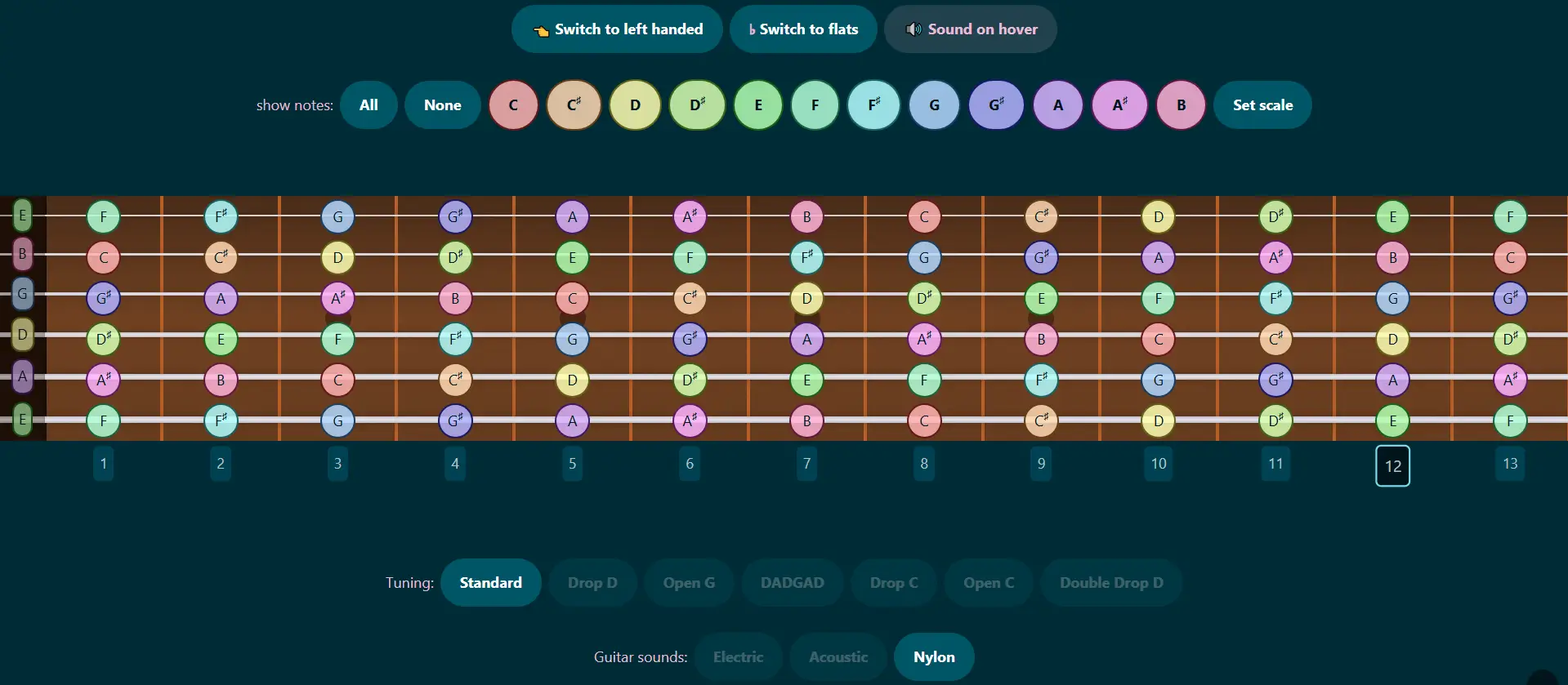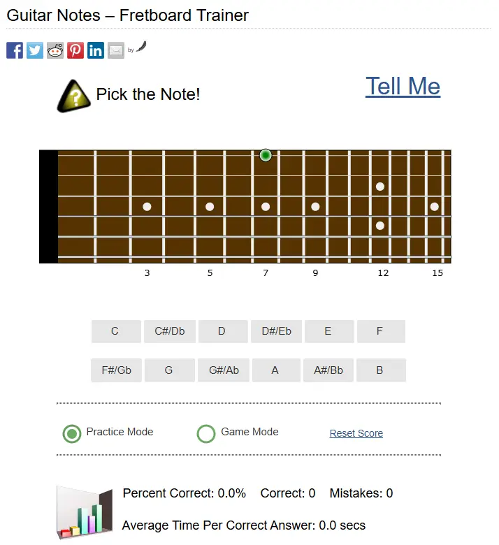 guitarorb: این سایت نیز یکی از پرکاربردترین ابزارهای یادگیری نواختن گیتار است که یکی از امکانات آن، بازی و تمرین با فرتبورد گیتار میباشد؛ به این صورت که این سایت به صورت رندوم یک نقطه از دسته ساز را مشخص میکند و شما باید حدس بزنید که آن قسمت چه نتی است. این کار در بهخاطرسپردن نت های گیتار بسیار کمککننده خواهدبود. البته این سایت قسمتهای دیگری مانند یادگیری انواع آکورد و نتخوانی گیتار هم دارد که با استفاده از آنها و با تمرین مداوم، میتوانید به یک گیتاریست حرفهای تبدیل شوید. برای بازدید از سایت موردنظر روی دکمه سبزرنگ زیر کلیک کنید.