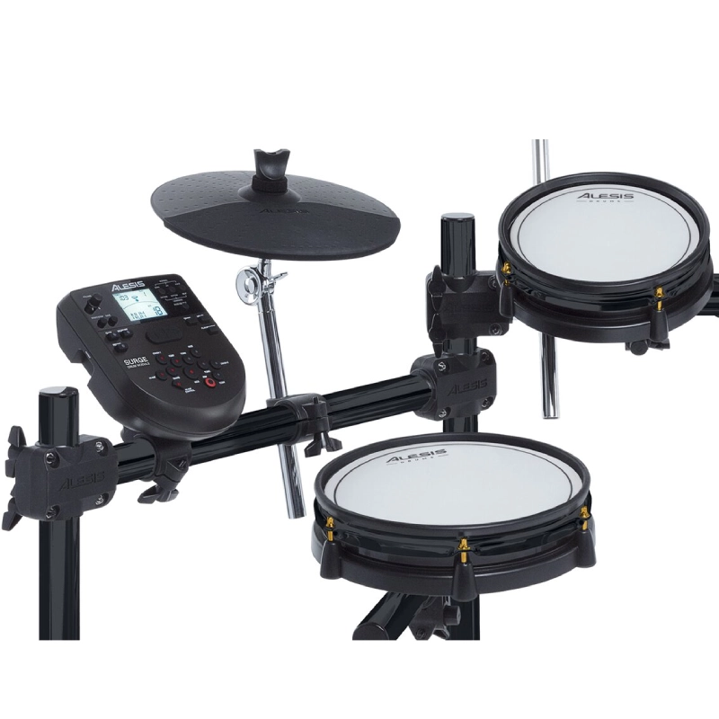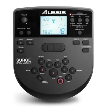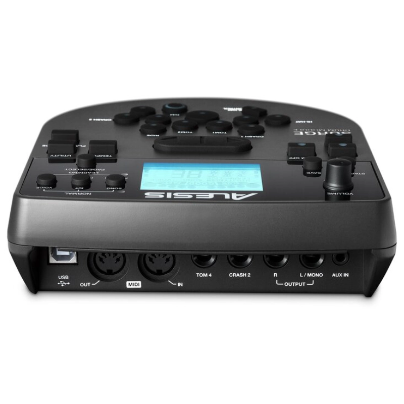 ماژول Surge در این مدل از همان سختافزارهای ثابتشدهای استفاده میکند که در نسخههای بالاتر مانند Surge Mesh دیده میشود. این ماژول دارای ۴۰ کیت ازپیشتنظیمشده و ۳۸۵ صدای مختلف درام، پرکاشن و افکت است. علاوه بر آن، شما میتوانید کیتهای کاستوم خود را بسازید و به دلخواه خود تنظیم کنید. از سوی دیگر صفحهنمایش LCD بزرگ به شما این امکان را میدهد که بهراحتی بین ست های مختلف سوییچ کنید. همچنین مترونوم داخلی، سیکوئنسر، قابلیت ضبط اجرا و ورودی AUX برای تمرین با بکینگ ترک در دسترس است. از طریق USB یا MIDI نیز میتوانید کیت را به لپتاپ یا کامپیوتر متصل کرده و از نرمافزارهایی مانند EZDrummer یا Ableton استفاده کنید.