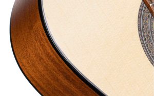 صفحه رویی این گیتار از چوب (Spruce) ساخته شده که بهخاطر شفافیت و وضوح صوتی، انتخاب اول بسیاری از سازندگان گیتار در جهان است. این چوب باعث تقویت تریبل و ریسپانس سریع سیمها میشود که برای قطعات کلاسیک و آکادمیک بسیار ایدهآل است.